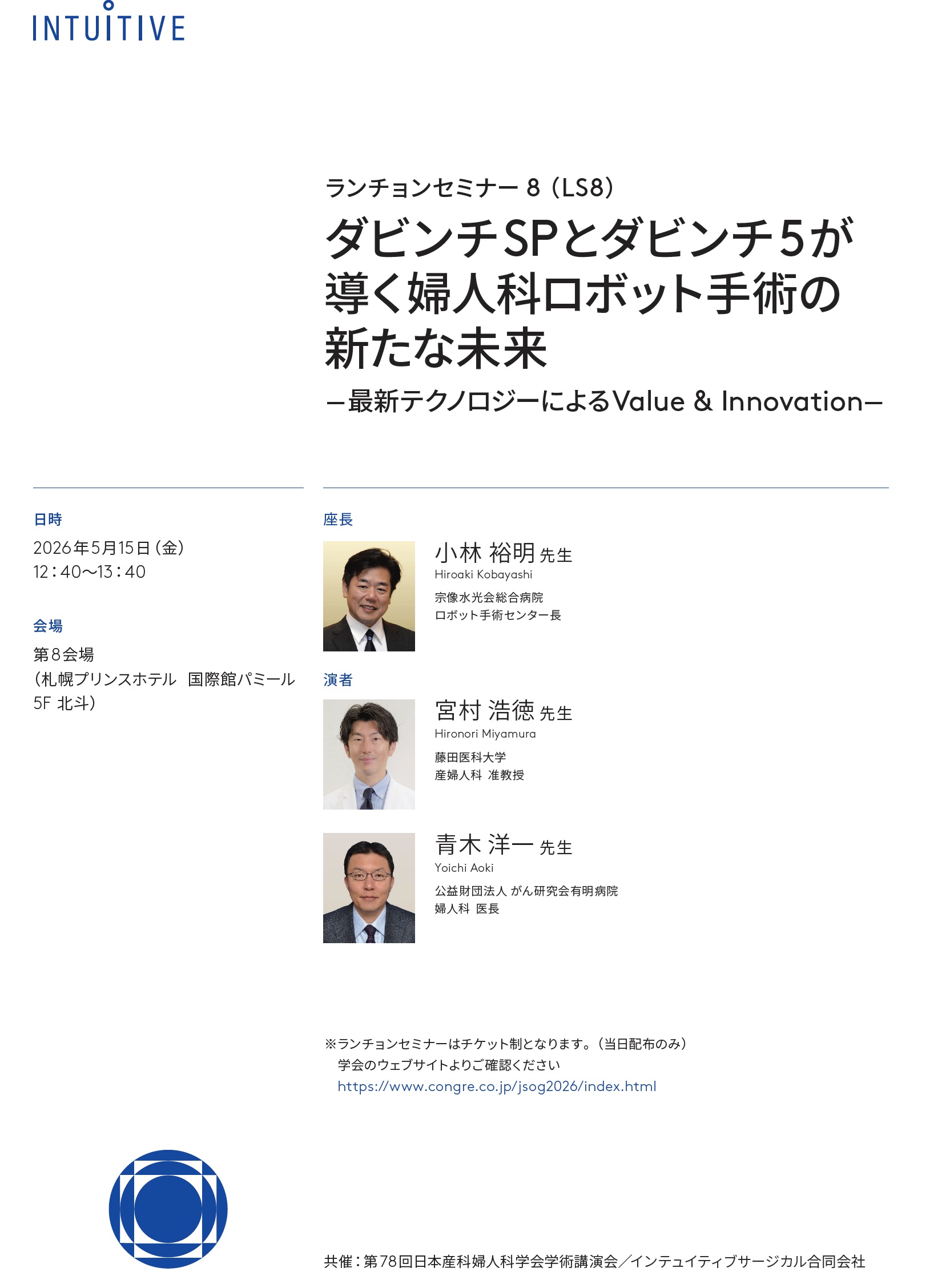 Stand by ランチョンセミナー8 ダビンチSPとダビンチ5が導く婦人科ロボット手術の新たな未来 ―最新テクノロジーによるValue&Innovation― 2026年5月15日(金) 12:40 - 13:40 第8会場 | 札幌プリンスホテル(国際館パミール) 5F 北斗 共催:インテュイティブサージカル合同会社 |